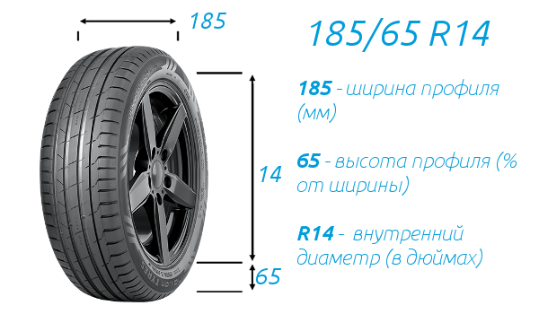 Размер шин обычно указывается на боковине старых шин или в руководстве по эксплуатации автомобиля. Размер шин состоит из трех чисел, разделенных буквами и символами. Первое число указывает на ширину шины в миллиметрах, второе ⎼ на высоту профиля шины в процентах от ширины, а третье ⸺ на диаметр обода в дюймах. Например, размер шины 185/65 R14 означает, что ширина шины составляет 185 мм, высота профиля ⎼ 65% от ширины, а диаметр обода ⸺ 14 дюймов.
